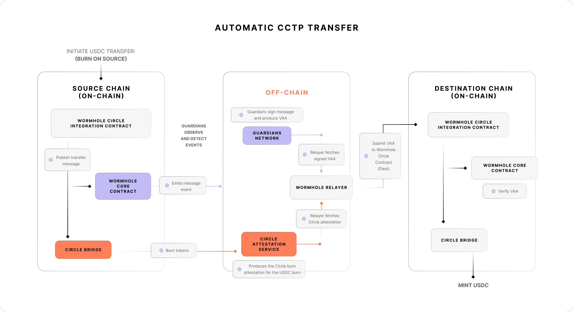 In an automatic CCTP transfer, you submit one transaction on the source chain, and Wormhole's relayer does the rest: it observes the Wormhole message and Circle burn, obtains the required attestations, and submits them on the destination chain to mint native USDC. You don't fetch a VAA or Circle attestation or call redeem, the relayer finalizes (and can handle destination gas).