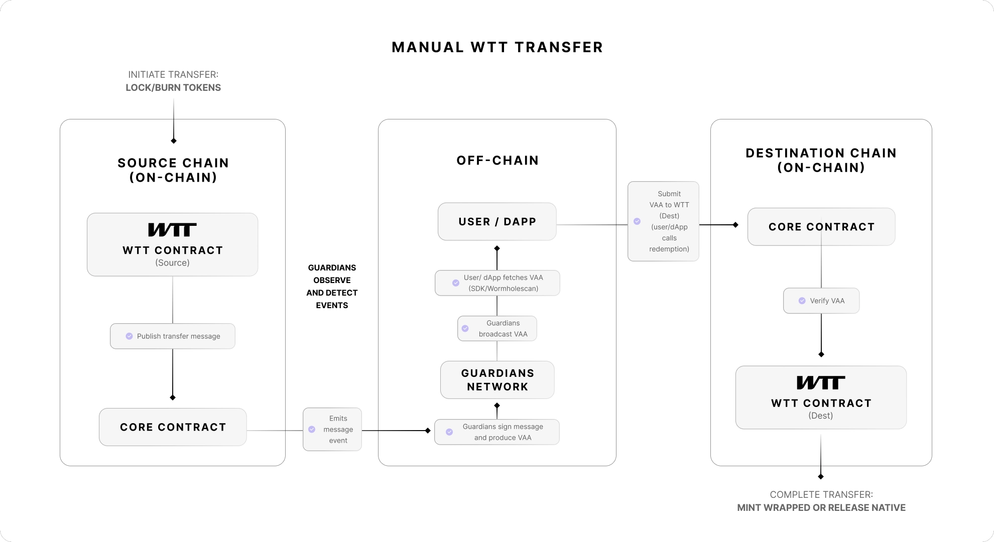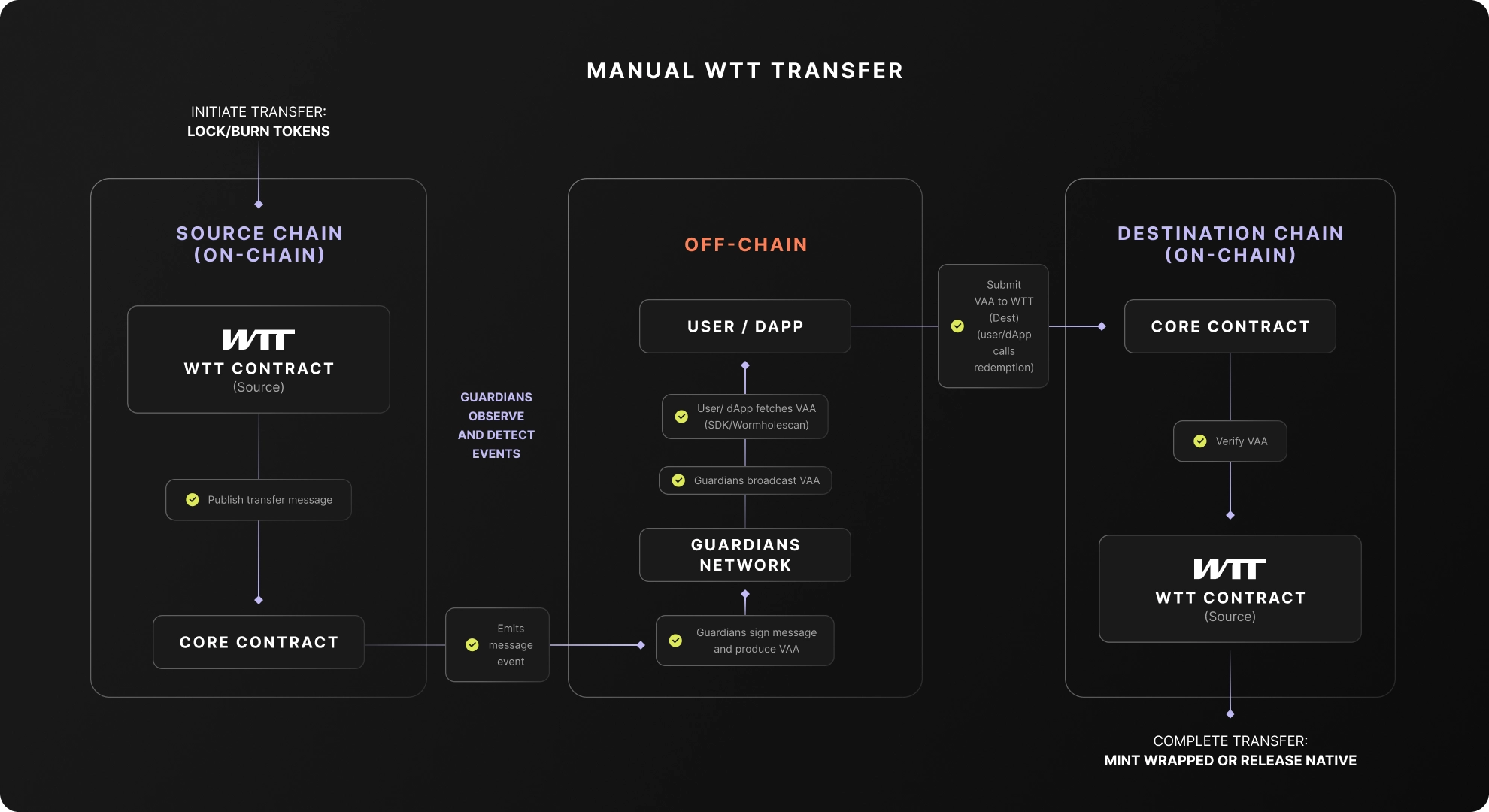 - Tracking the transfer: The returned transaction IDs allow you to track the transfer's progress both on the source chain and within Wormhole’s network.